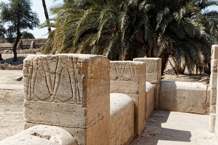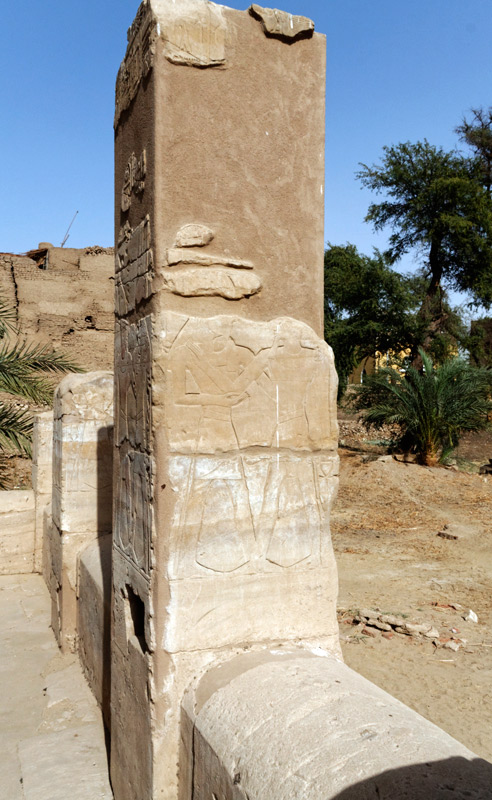A gauche, face Ouest : le 3ème pilier à partir du Nord a conservé le cartouche du Roi Aménophis II (Amenhotep) <Aa-Kheperou-Rê>. Le fils de Thotmosis III est ainsi le premier à avoir voulu remettre en état le temple.