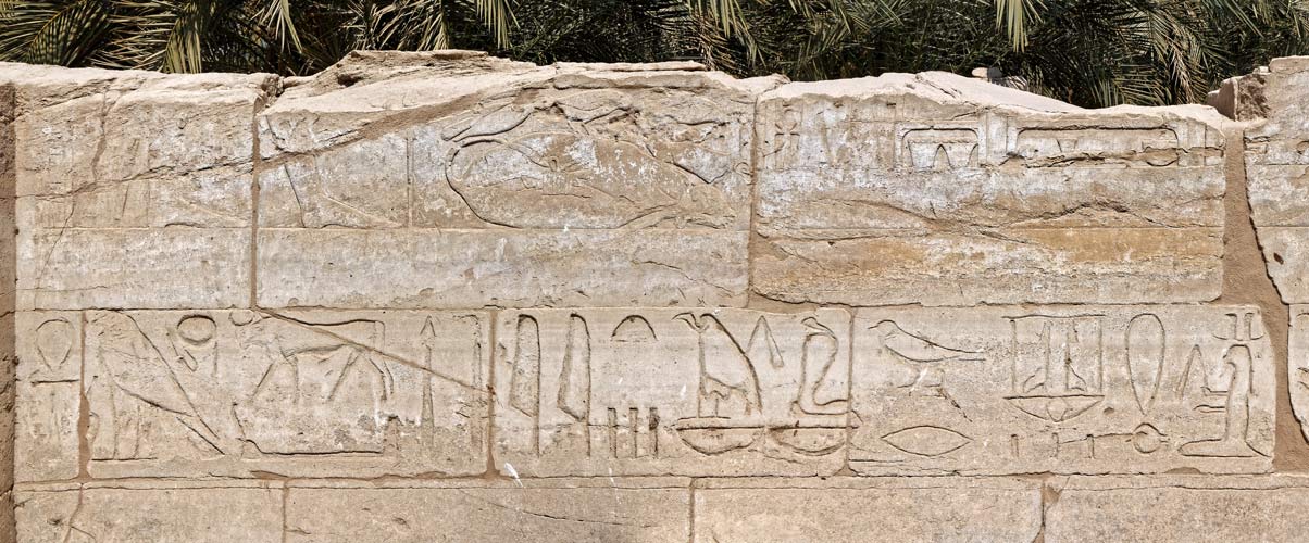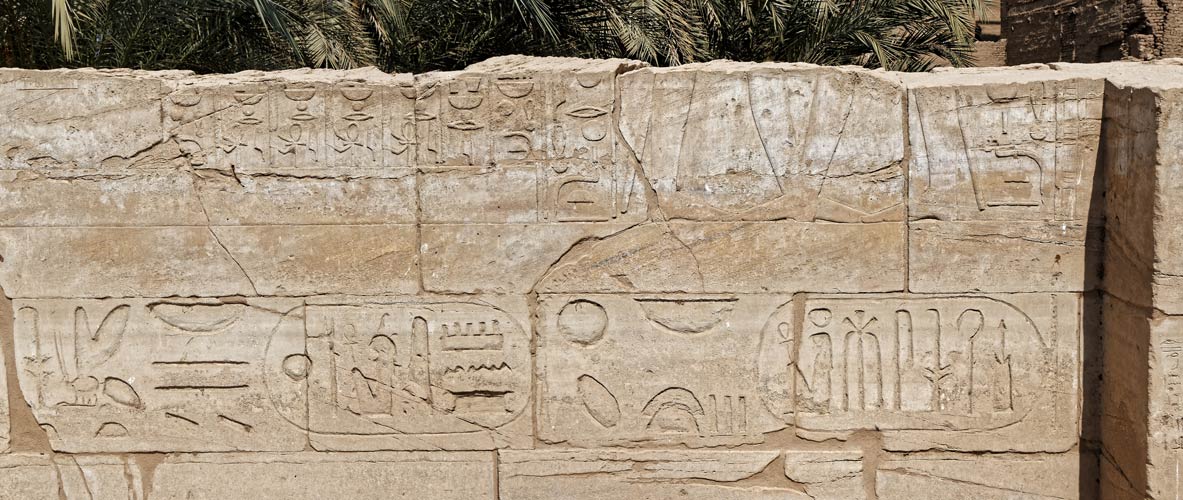 En dessous, un texte de Ramsès III : "Vive l'Horus, Taureau victorieux, grand de royauté, les deux maîtresses, grand de jubilés comme Ttatenen "
