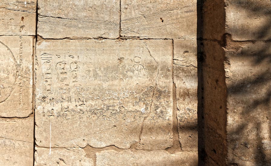 Dans l'ébrasement Ouest de l'entrée Nord, partie où la porte pouvait se rabattre après ouverture, un pr^tre a gravé ce s graffiti (extraits) : "le prêtre Ouab d'Amon-Rê-Soter, Hory," suivi des noms de son père et grand-père, tous deux prêtres purs.