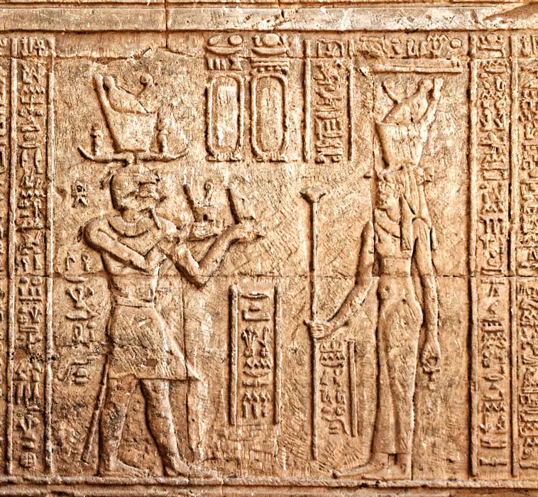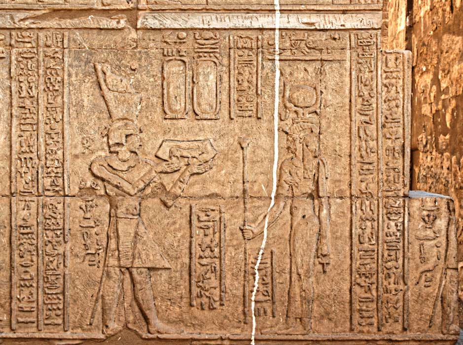 Par l'offrande des couronnes, le roi veut garantir l'union des deux terres. Mout lui garantit la royauté du Sud et du Nord en lui remettant les couronnes. Cette offrande est spécifique de la période gréco-romaine (S. Cauville, p.131).