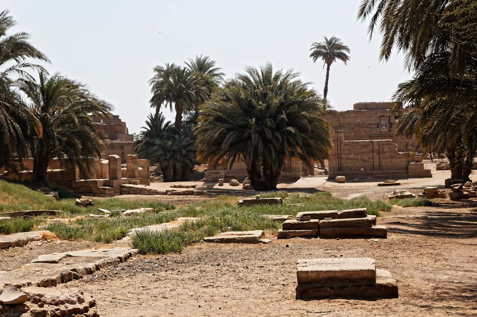 Le site de Tôd s'étend sur plusieurs hectares au milieu de la ville dont les maisons sont visible au fond à droite. Il comprend plusieurs édifices : un temple très ruiné dont la façade est en partie cachée par des palmiers sur la vue ci-dessus et une chapelle reposoir à gauche sur la vue. Au temple, sont associés les restes d'un lac, d'un dromos et d'un débarcadère. Des blocs provenant