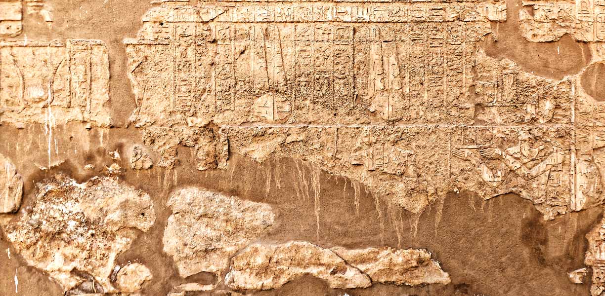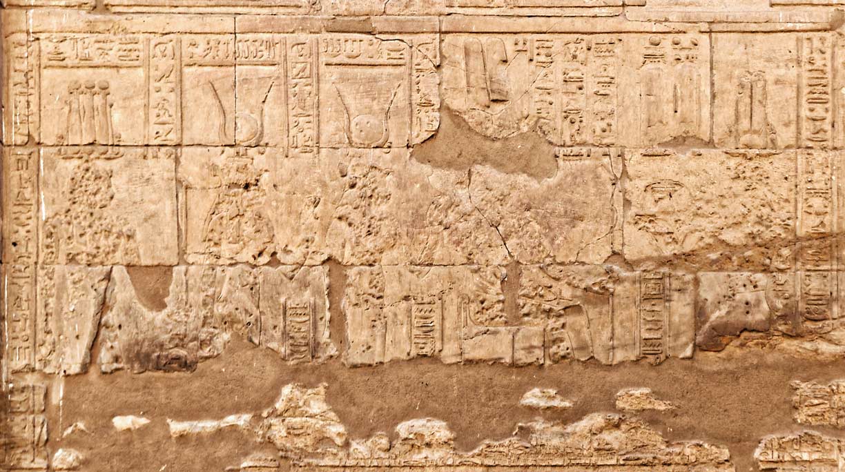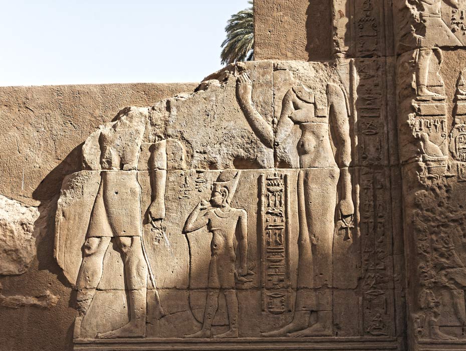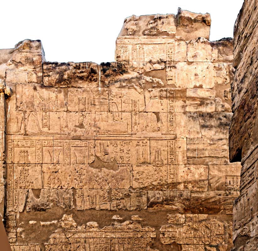 Cette scène a été gravée en relief levé sur le texte de Sésostris 1er dont les signes en relief dans le creux avait été bouché par du plâtre. le calcaire du mur a subi de graves altérations qui ont conduit à la disparition de la partie basse (Chr. Thiers, fascicule II, p.72, note en bas de page). Le texte de Sésostris 1er est présenté dabs une partie spéciale (voir la barre de navigation).