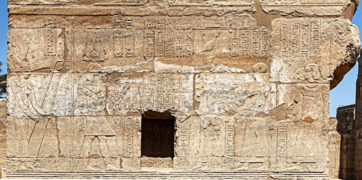 - à gauche, le roi se tient devant Ptah-Tenen, Sekhmet et Bastet dont les représentations ont été martelés.