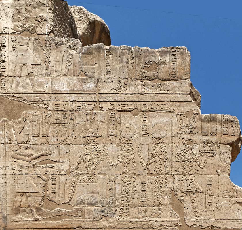 En haut, restes de 2 scènes : à gauche, le roi offre des fleurs à des divinités. A droite, les jambes du roi