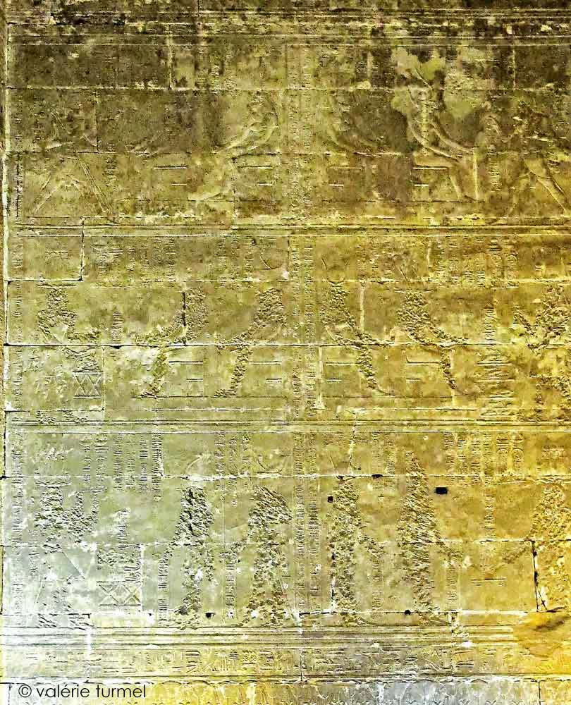 Le roi Ptolémée joue du sistre devant Nekhbet la Blanche de Nekhen, œil droit de Rê avec lequel il se lève le jour qui entoure son disque des rayons de son oeil pour écarter celui qui se trouve sur son chemin, et Horus de Nekhen, faucon vénérable au doux amour.