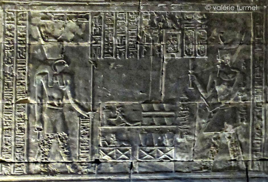 Le roi Ptolémée fait l'offrande à Horus de Behedet, grand dieu maître de Mesen, au plumage bigarré quand il sort de l'horizon, à la tête des sanctuaires du Nord,idole vénérable, souverain du pays du dieu qui se complaît au pays de Pount.