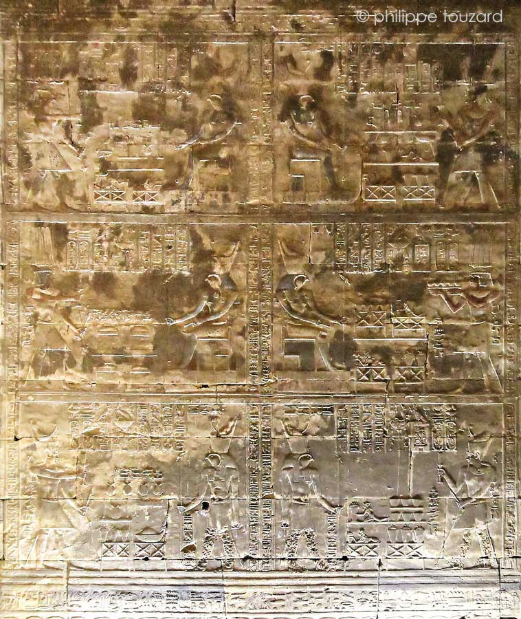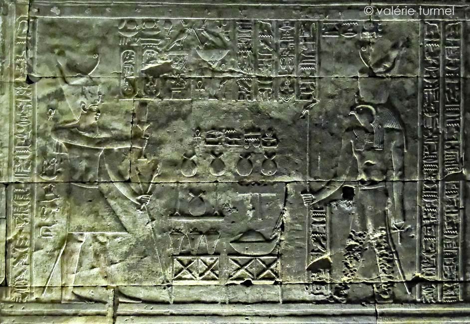 Le roi Ptolémée IV Philopator fait l'offrande du menpeh à Horus de Behedet, grand dieu maître du ciel au plumage bigarré quand il sort de l'horizon, à la tête des sanctuaires du Sud, scarabée ailé .vénérable qui de montre au ciel et remplit la terre d'or.