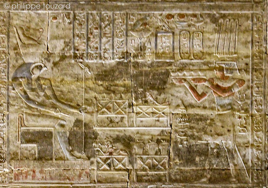 Le roi Ptolémée fait l'offrande à Horus de Behedet, Shenty, horizontain à la navigation quotidienne, l'aîné, le maître de la vie qui illumine les Deux Terres.