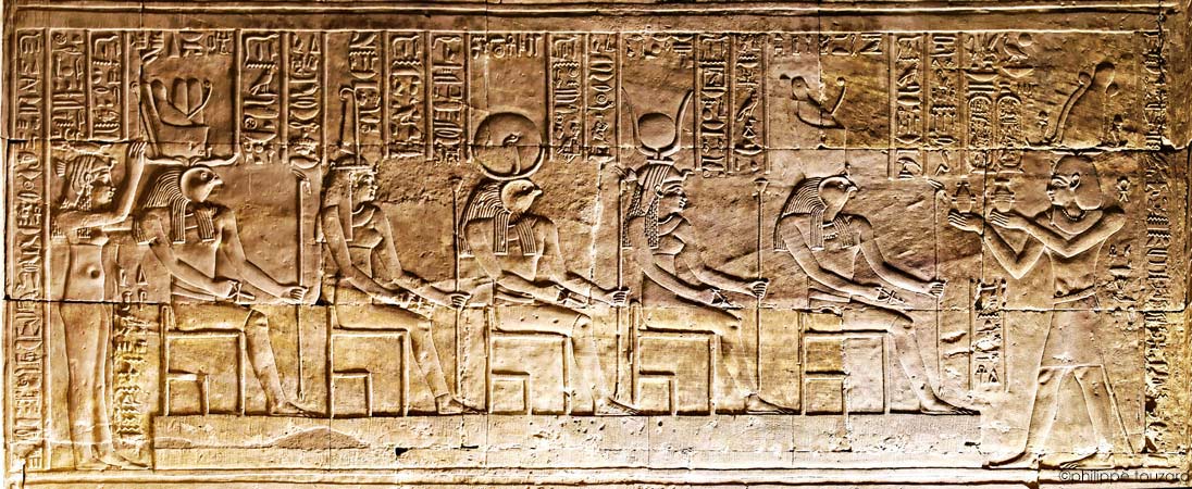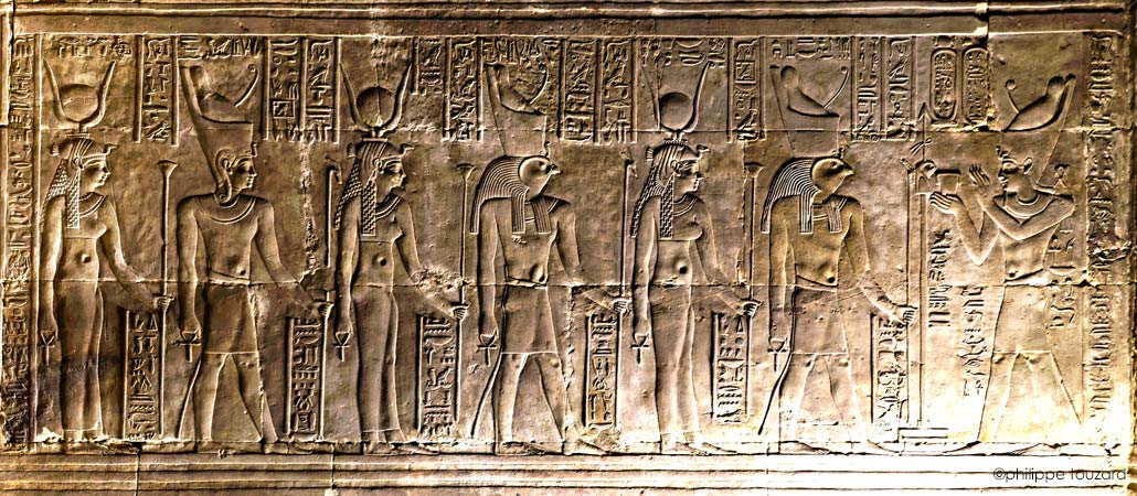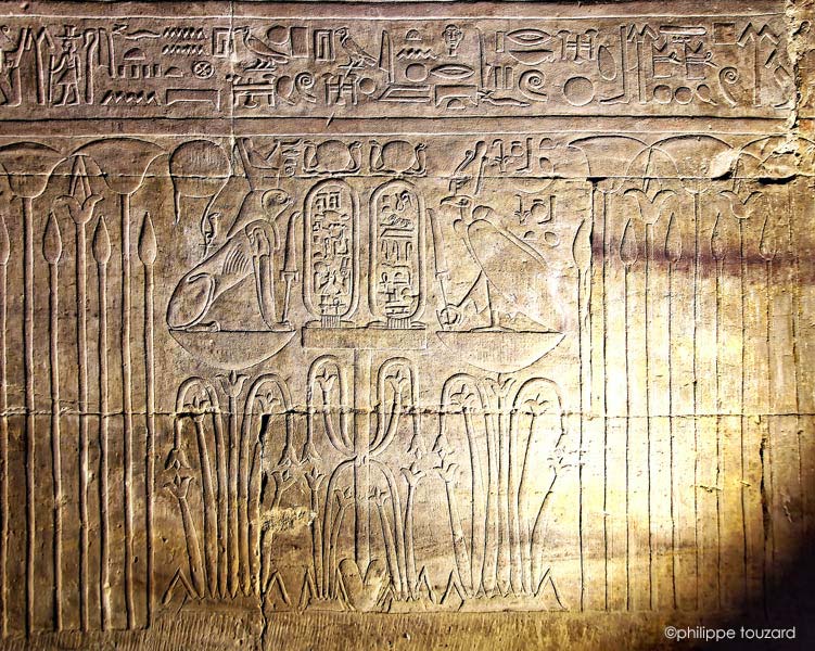 Ce motif est placé deux fois sur le soubassement. À droite, la déesse Nekhbet est représentée en vautour. À gauche, le faucon Behedety porte la double couronne Chaque cartouche est surmonté du disque de Behedety. Chaque cartouche de Ptolémée IV est surmonté du disque de Behedety.