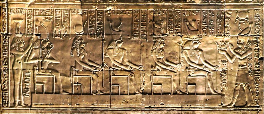 Sur le registre du haut, le roi présente la double couronne à 6 divinités :