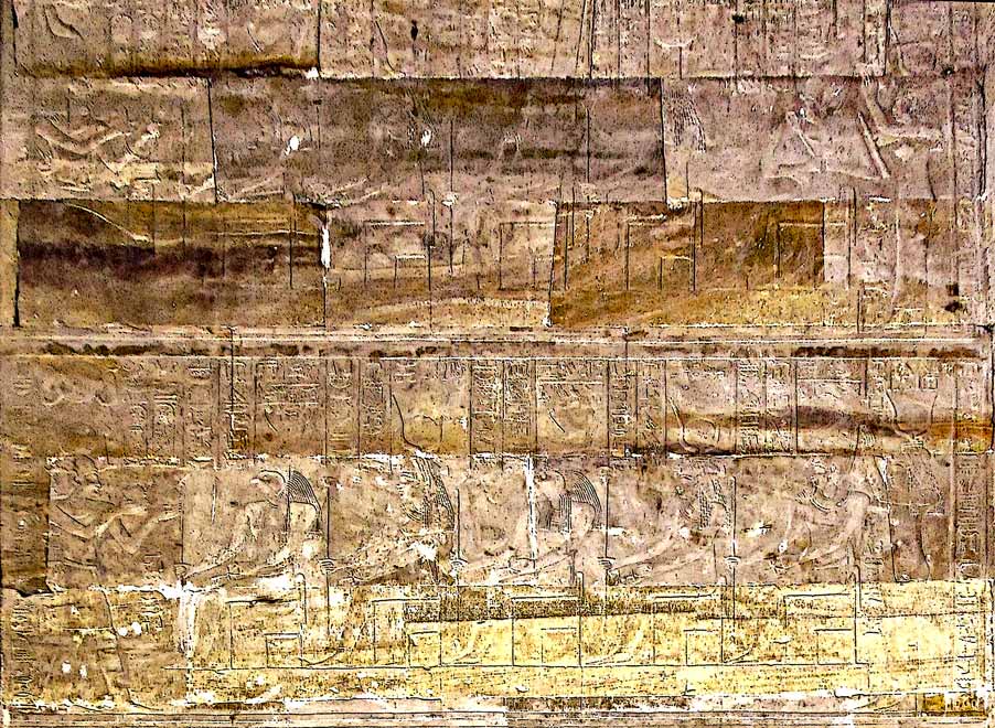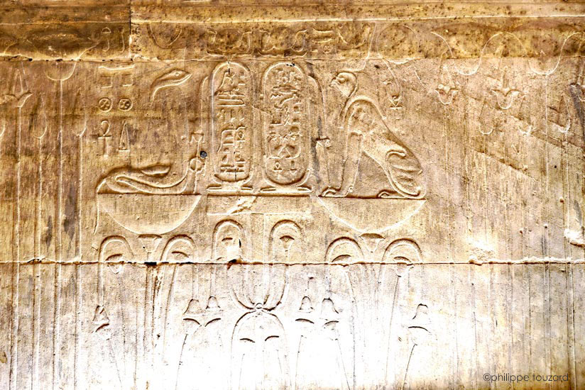 Ce motif est placé deux fois sur le souibassement. À gauche, la déesse Oudjet de la ville de Re est reresentée comme un cobra. À droite, le faucon Behedety porye la double couronne. Chaque cartouche de Ptolémée IV est surmonté du disque de Behedety