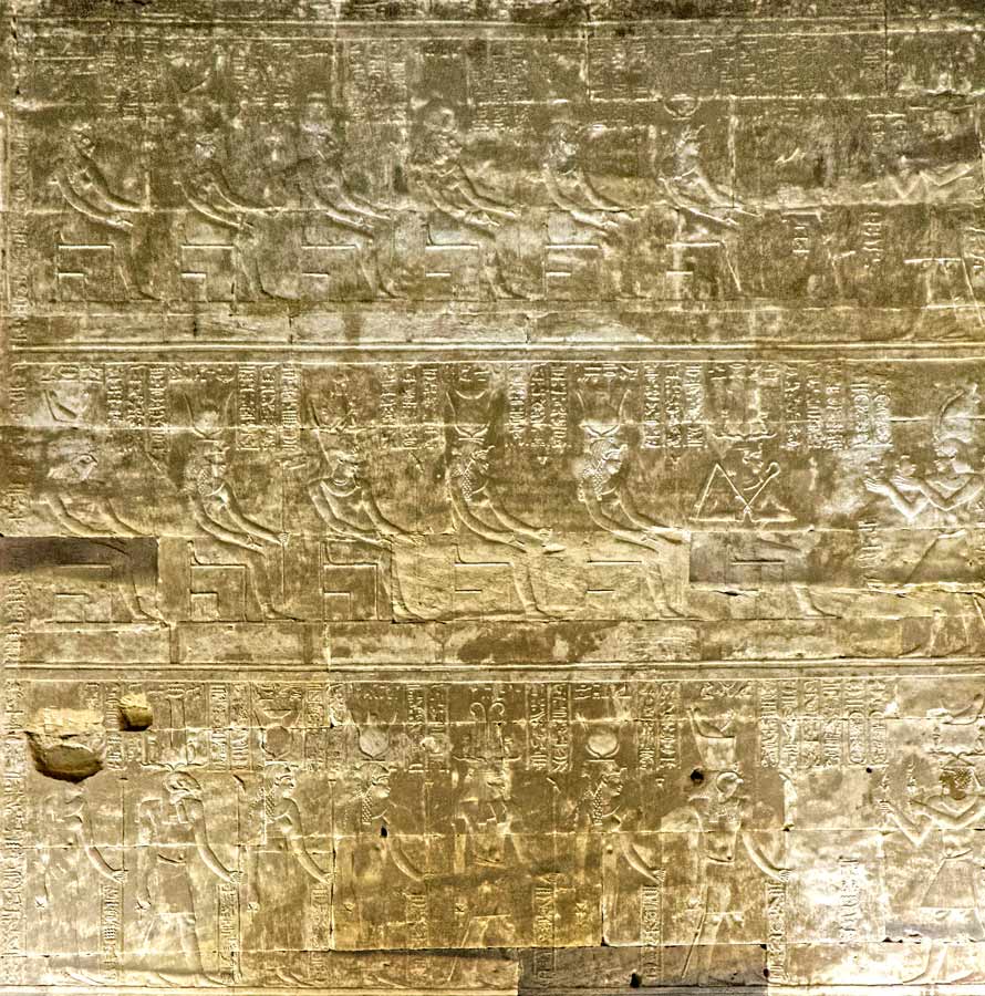 Le roi Ptolémée IV joue du sistre devant Ihy, fils d'Hathor avec Hathor, dame d'Iounet, dame do ciel qui réside à Edfou, patronne des sistres, les dieux font de la musique pour l'apaiser, les déesses lui font de la musique pour dissiper sa fureur; Nekhbet la Blanche de Nekhen, au bras long, patronne d'Edfou, protectrice du faucon qu'elle abrite de ses ailes; Sekhmet la Terrible qui préside à la place d'exécution,