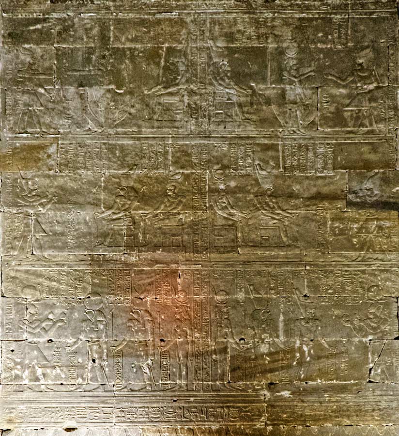 Le roi Ptolémée IV devant la déesse de l"arbre qui lui donne un autre sceptre, attribut de sa fonction. Derrière l'arbre, Horus de Behedet, qui transperce Nees dans Set-Outep, maître du harpon qui terrasse les rebelles..