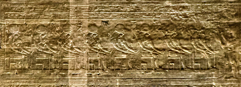 Registre du haut (photo manquante) : le roi Ptolémée IV est agenouillé dans l'arbre Ished et Horus lui tend un sceptre. Derrière le roi, se tiennent Thot, qui départage les deux adversaires et satisfait les dieux, le maître du temps qui compte les années et Sechat la jeune, patronne de la bibliothèque, qui inscrit le temps de l'Ennéade et grave les années de celui qui est resté le souverain. .Devant le