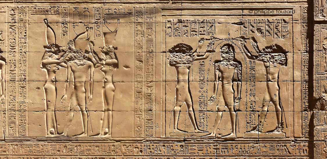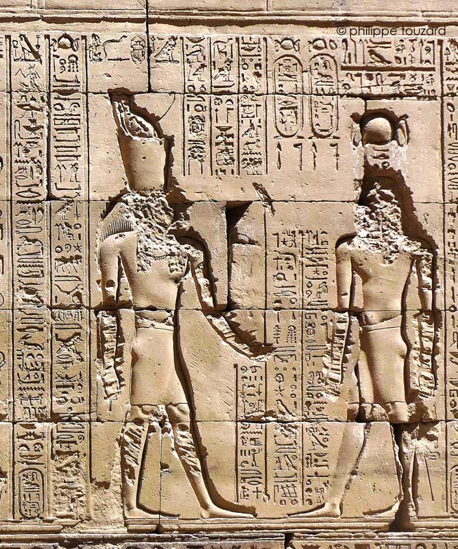 Après la purification, le roi est couronné de la double couronne par Ouadjet à droite et Nekhbet à gauche. Ouadjet porte le couronne de la Basse Égypte dont elle est la protectrice et Nekhbet celle de la haute Égypte.