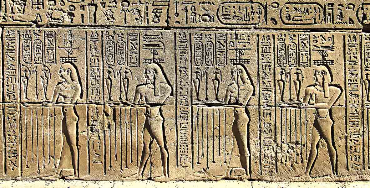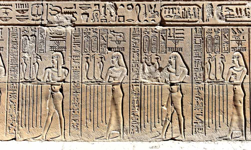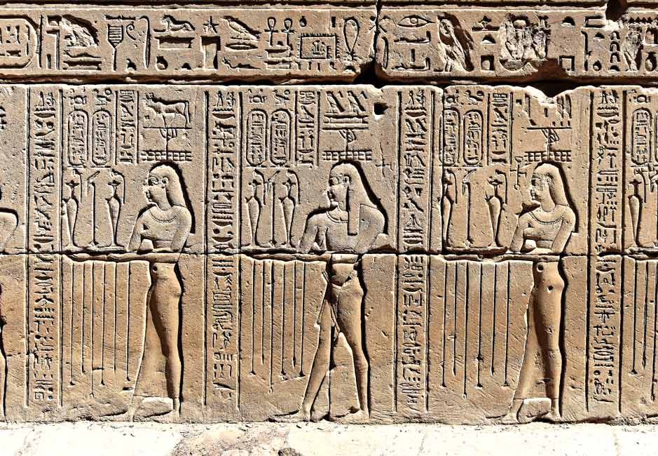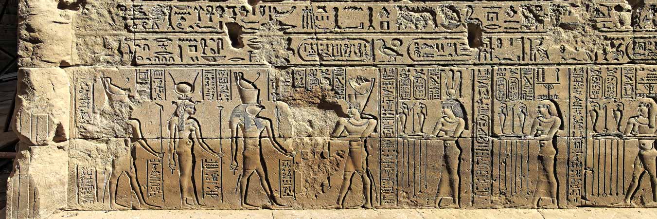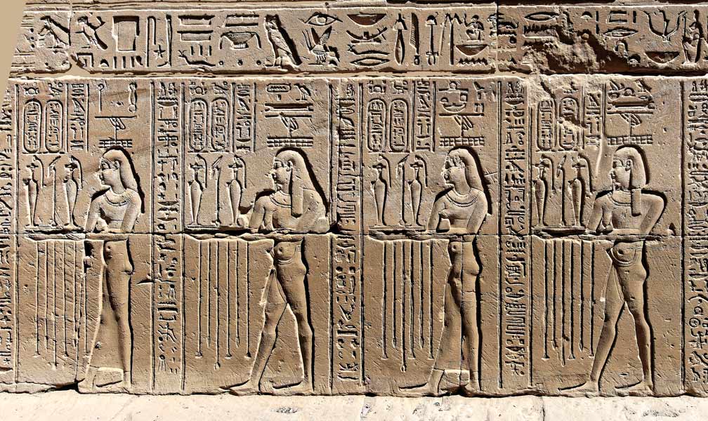 Comme sur le soubassement de la paroi ouest de la cour, le défilé des personnages géographiques liés aux nomes de Basse Égypte est représe,té sur le soubassement de la paroi estérieure Ouest du pronaos.