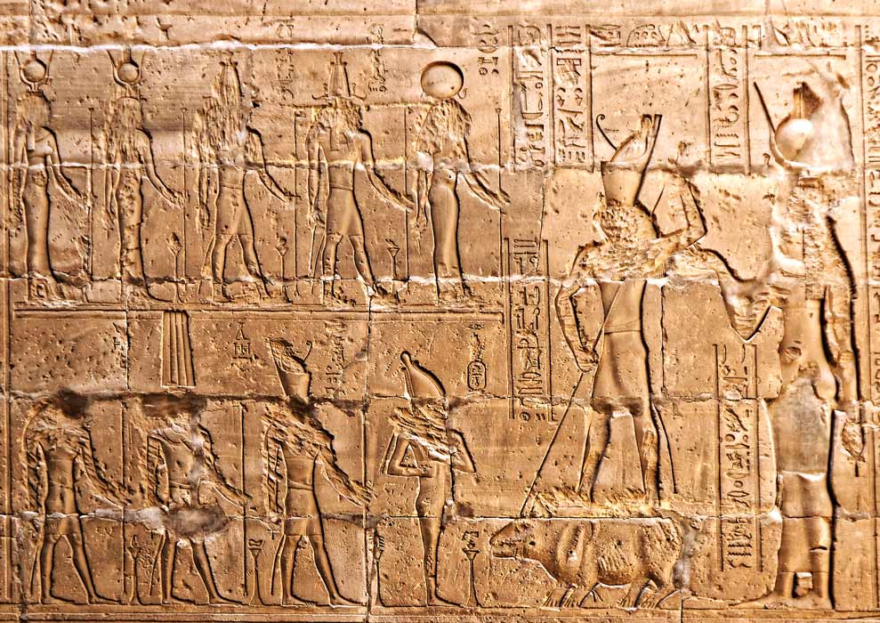 L'autre paroi du corridor est formée par la partie interne de l'enceinte. Horus transperce l'hippopotame (représentant Seth) en présence des dieux.