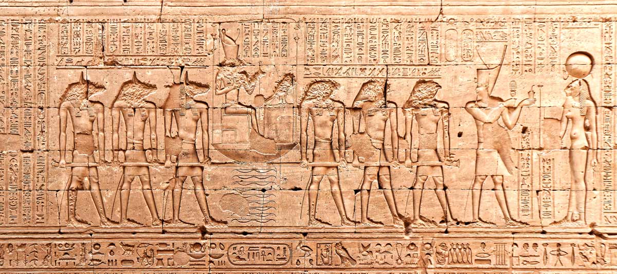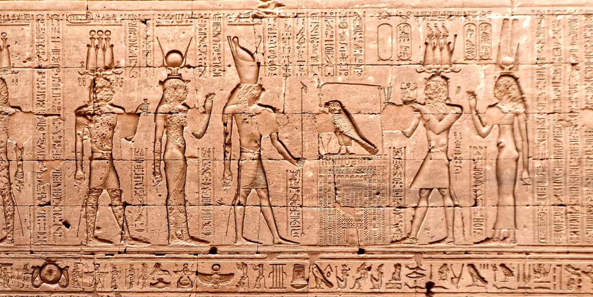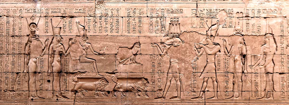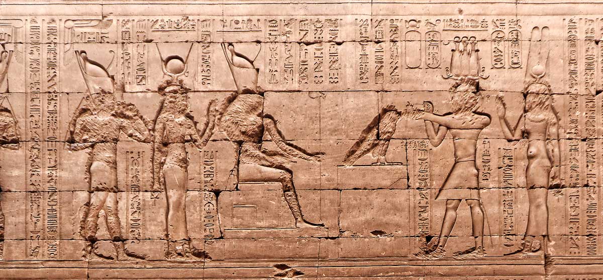 Le roi et la reine encense la scène, action de purification devant l'Horus vivant et Horus de Behedet, suivis d'Hathor et d'Ihy, dieu enfant fils d'Hathor.
