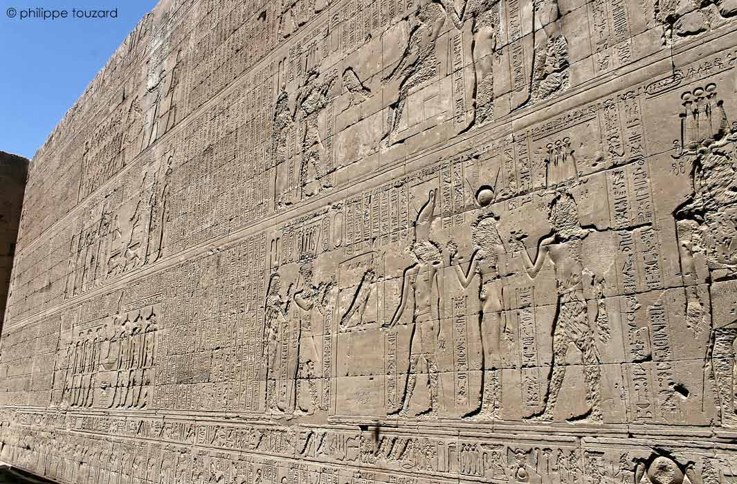 La paroi interne Nord-Ouest de l'enceinte est consacrée à l'illustration de le fête du couronnement du faucon, illustrationsc reproduite sur la paroi Nord-Est.