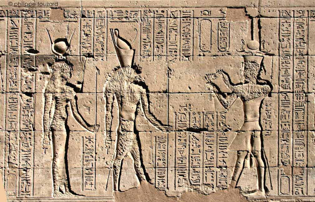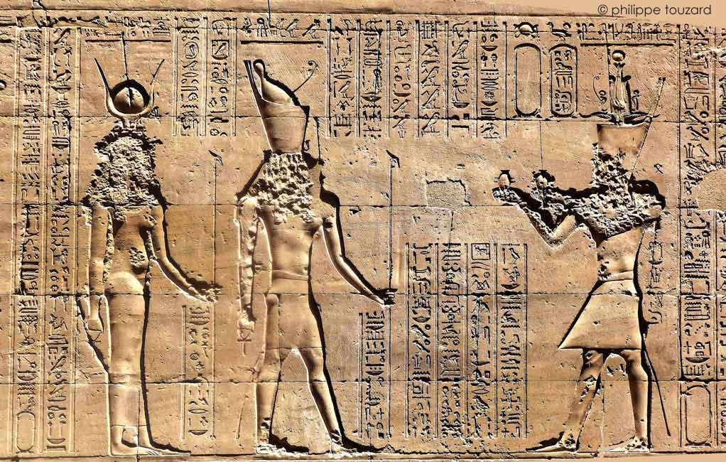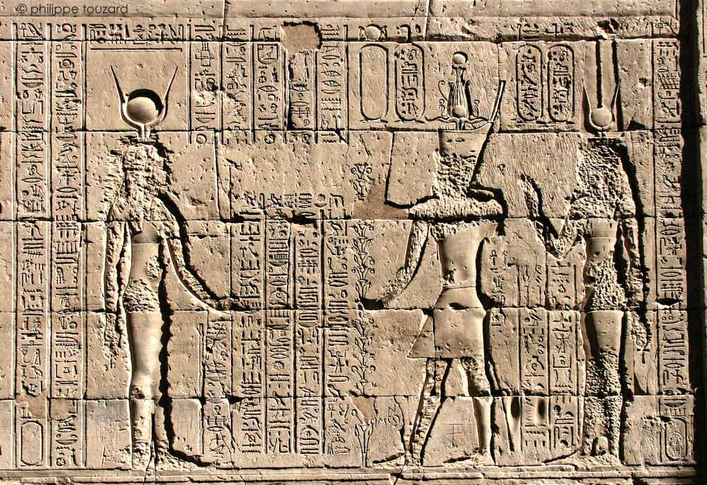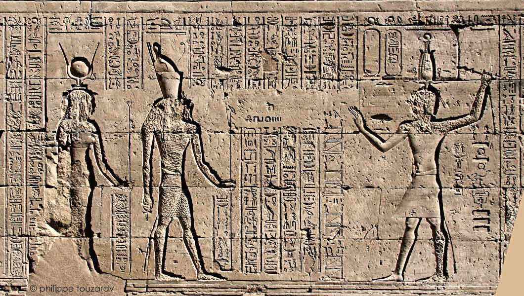 Le roi Ptolémée V Epiphane est accompagné de la reine Cléopae Ier. Il offre un bouquet monté harmonieux et majestueux à la déesse Hathor, dame de Iounet, œil de Rê, qui réside à Edfou.