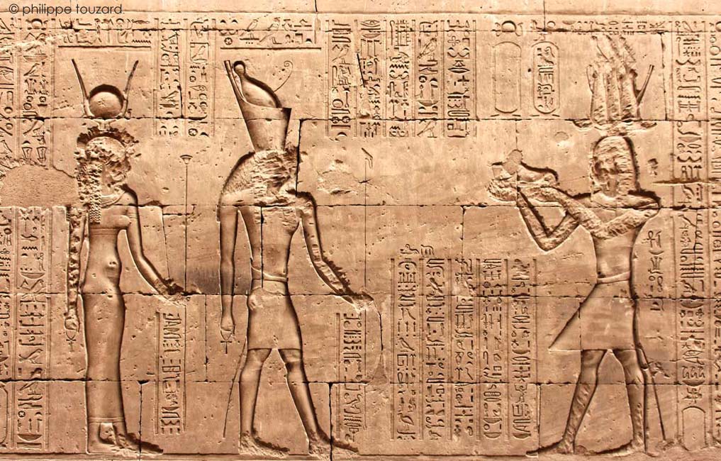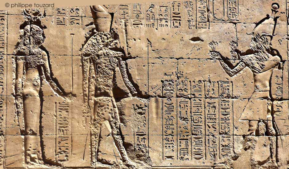 Le roi Ptolémée V offre des lotus à Horus et à Hathor, dame de Iounet, œil de Rê, qui réside à Edfou. En offrant le lotus, le roi perpétue le mécanisme de la création : le soleil enfant sort du calice de la fleur elle-même liée à l'élément liquide.