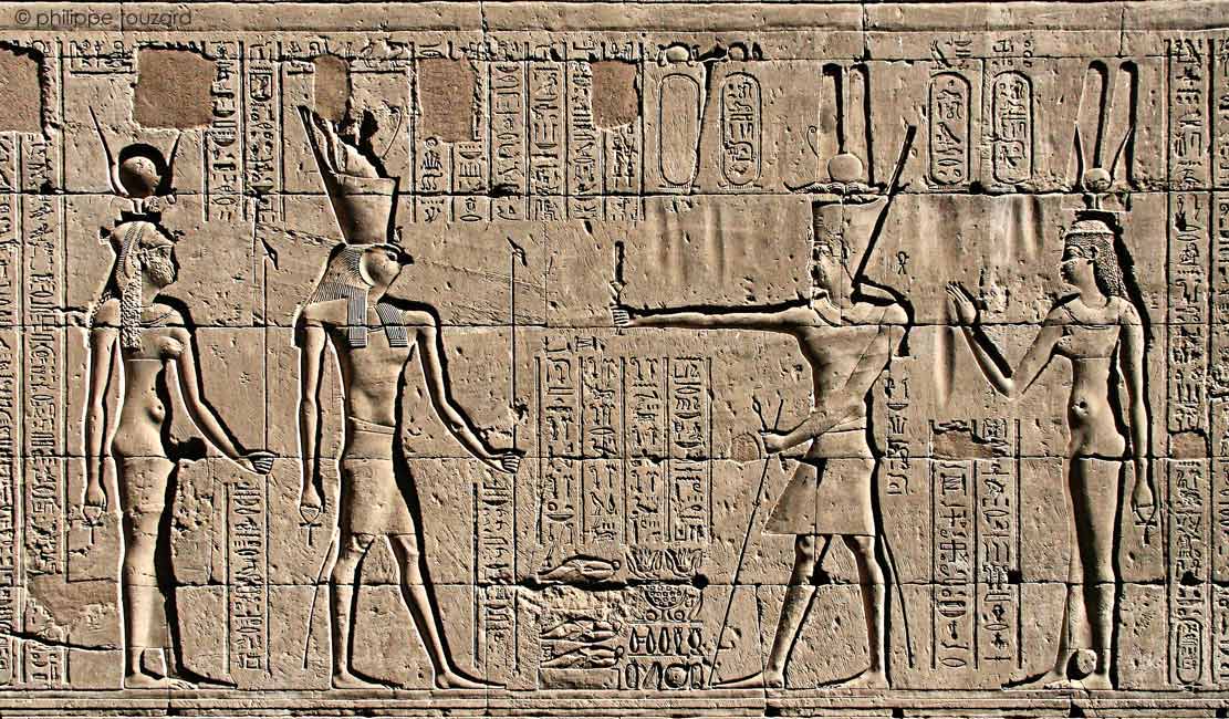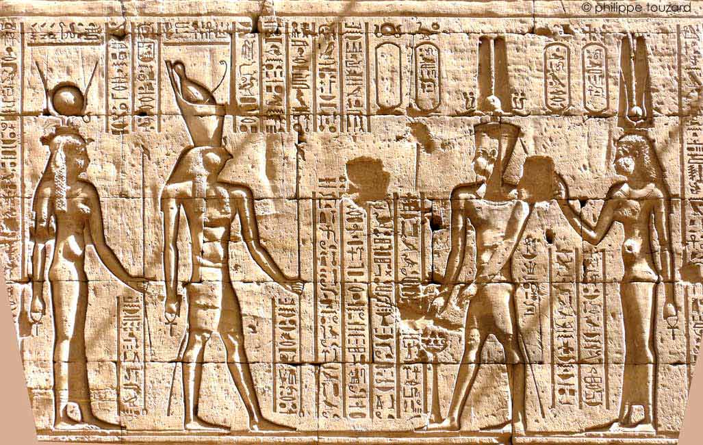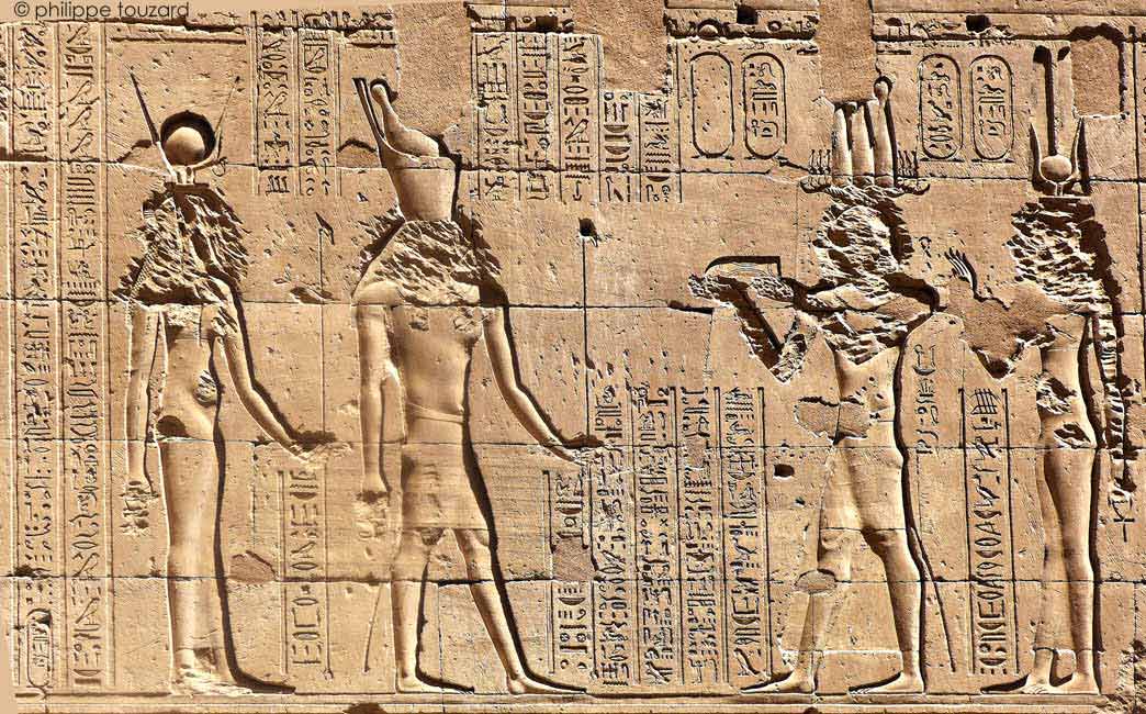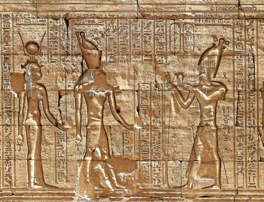Le roi Ptolémée V accompagné de la reine Cléopae Ier montre à Horus de Behedet et à Hathor, dame de Iounet