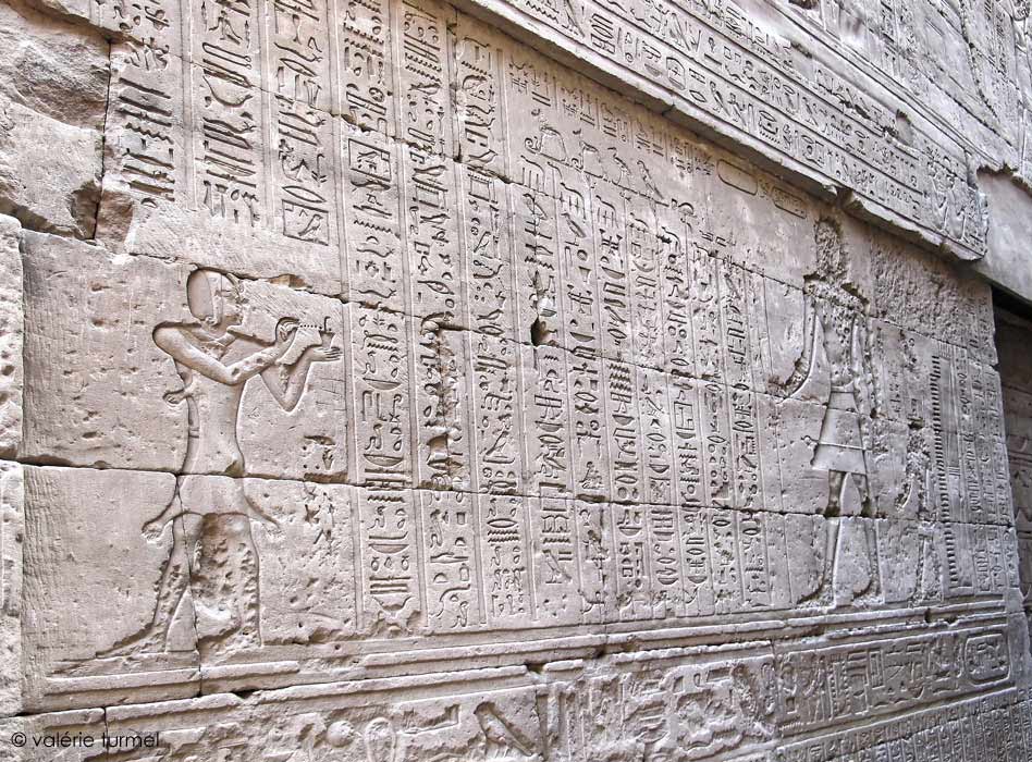 Après la purification, le roi est couronné de la double couronne par Ouadjet à gauche et Nekhbet à droite. Ouadjet porte le couronne de la Basse Égypte dont elle est la protectrice et Nekhbet celle de la Haute Égypte.