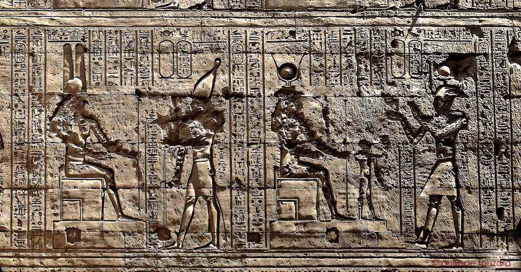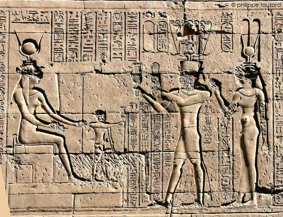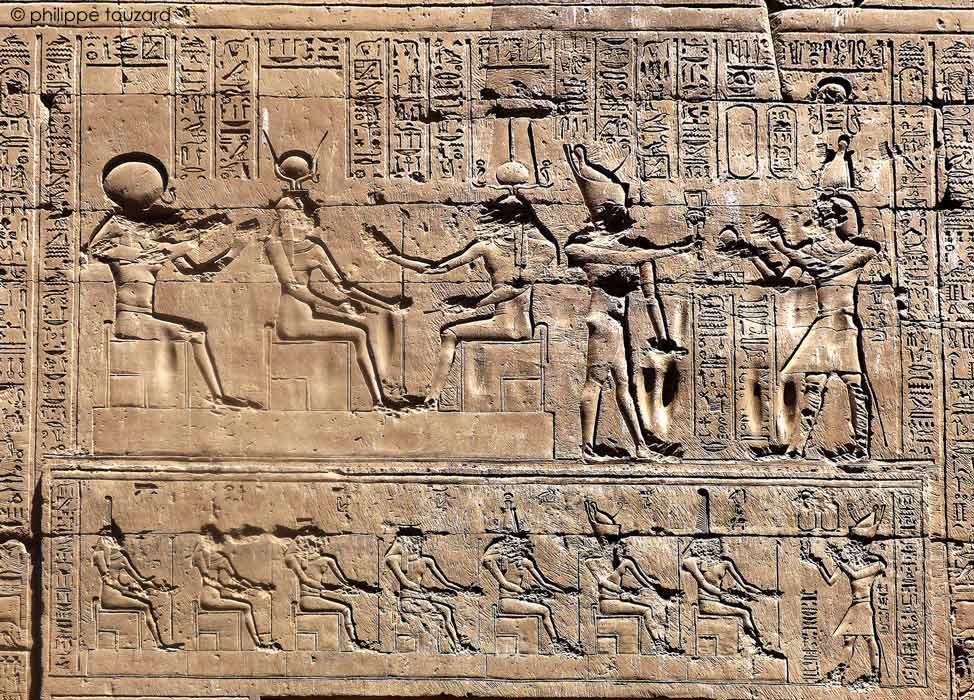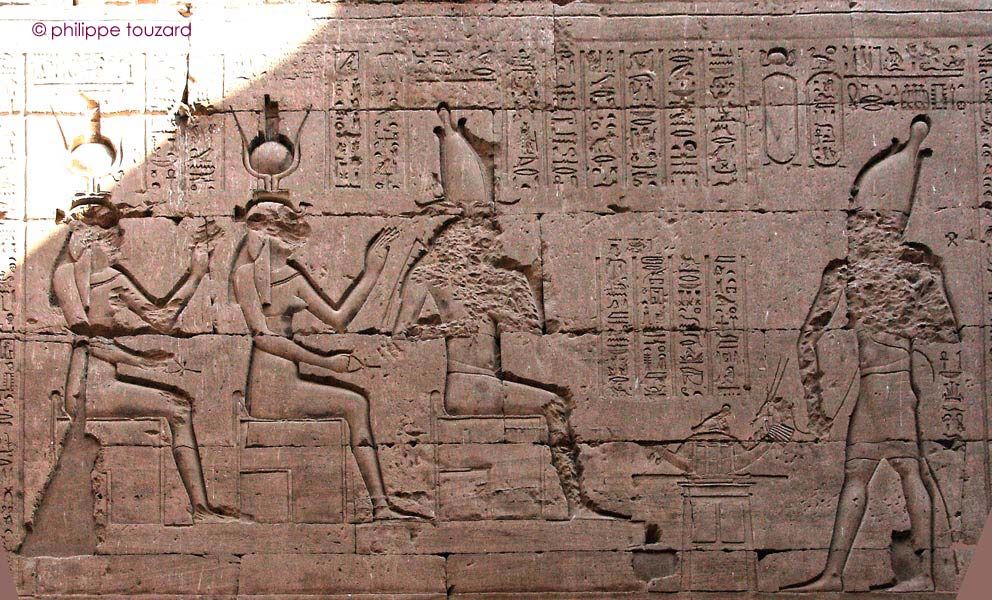 Le roi Ptolémée X Alexander consacre des offrandes avec son sceptre sekhem devant Hathor, dame de Iounet, œil de Rê, qui réside à Edfou. Devant la déesse assise sur un trône, Harsomtous, fils d'Hathor se tient debout.