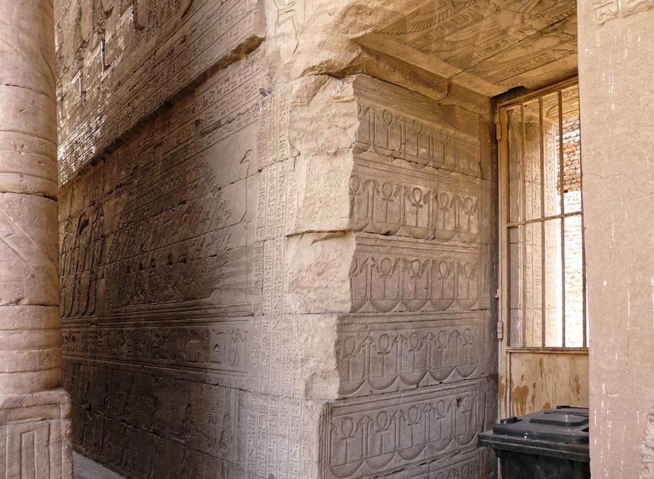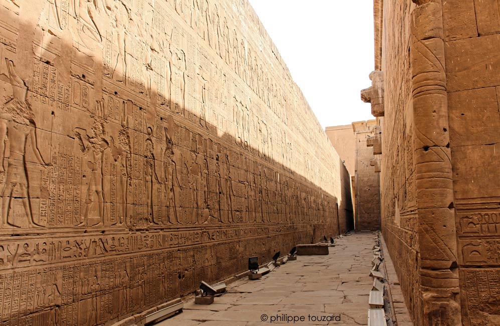 A l'extrémité de la colonnade est de la cour se trouve l'entrée du corridor côté est. A droite, une porte donne sur l'extérieur. A gauche, le dévut de la façade. Les scènes de la paroi Est se commence par une scène identique à celle du côté Ouest au cours de laquelle des dieux tirent un filet rempli de prisonniers et d'animaux; les scènes supérieures sont très difficille à observer compte-tenu de l'étroitesse du passage au début du corridor.