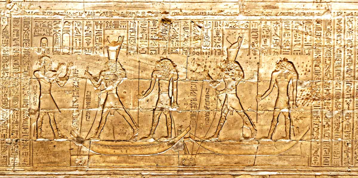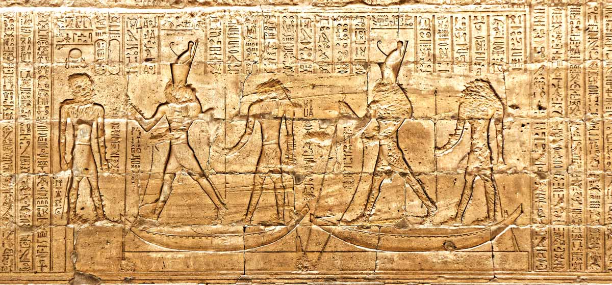 A l'avant de sa barque, Horus se prépare à son combat contre Seth représenté par un hippopotame dans les marais. Derrière lui sur la barque, Isis et Harsomtous. Il est aidé par le roi Ptolémée X qui veut aussi transpercer l(hippopotame. En dehors de la barque, Thot consigne la scène suivi par Horus, maître de Mesen et Isis.