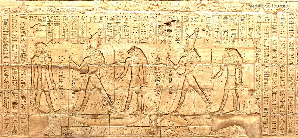 Sur la 2ème barque à gauche, Horus de Behedet actionne la 2ème lance, accompagné lui-aussi d'un génie.