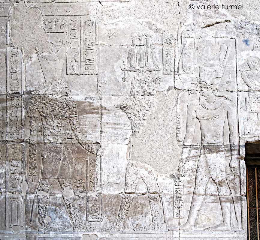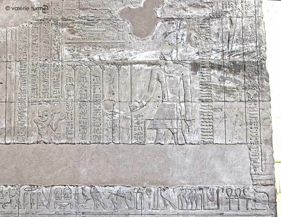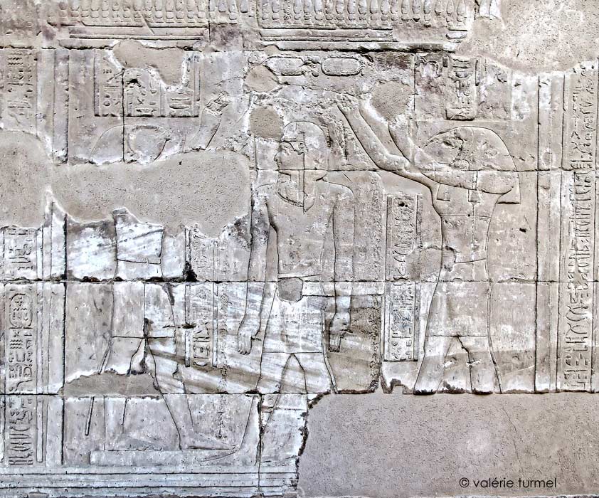 Cette scène de sortie du palais se retrouve à multiples reprises dans le temple et notamment symétriquement du côté Ouest de cette paroi Sud. Sur cette paroi, les cartouches sont vides.