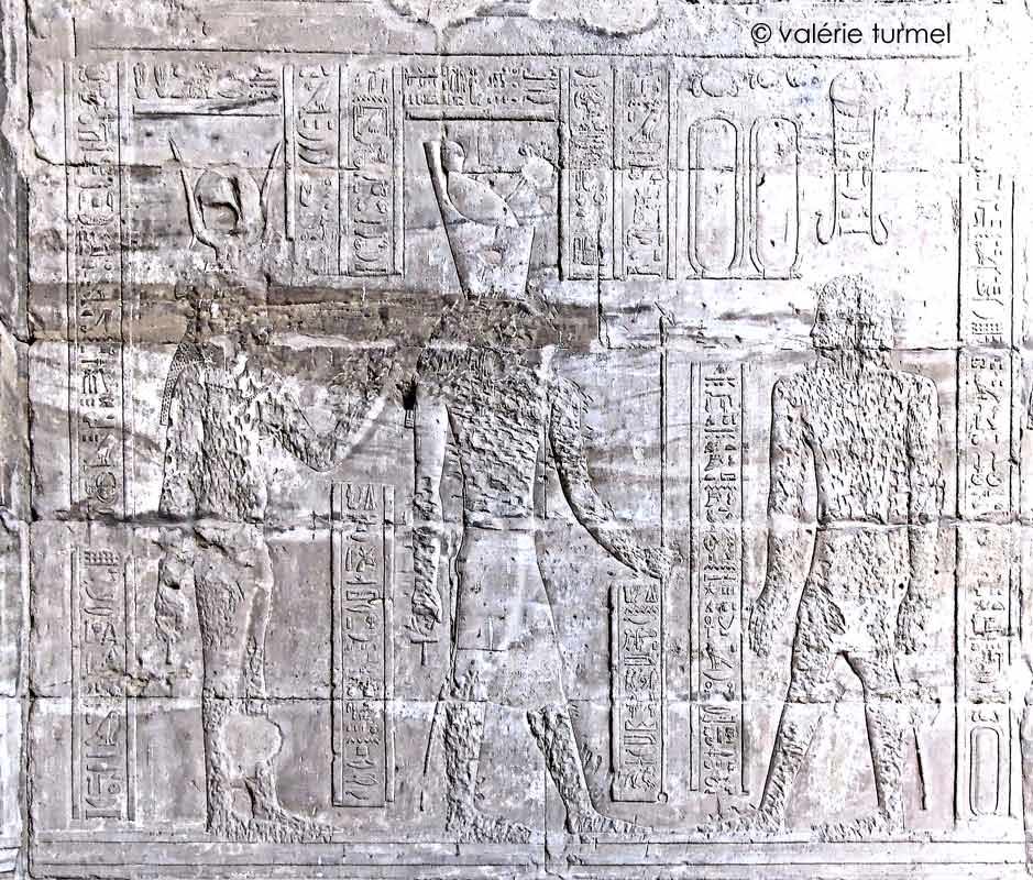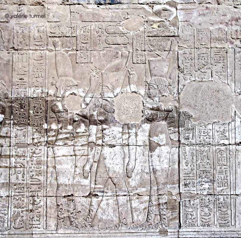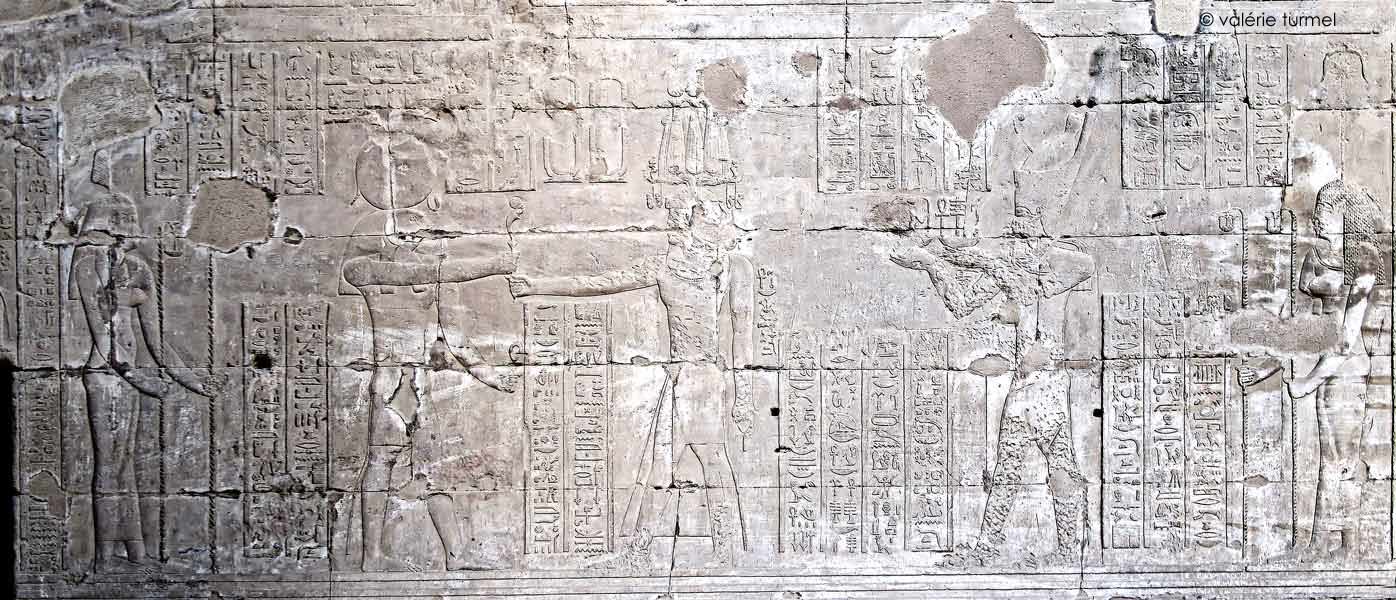 Le roi se tient devant Horus de Behedet et Hathor, dame de Dendara, oeil de Rê, qui réside à Edfou.
