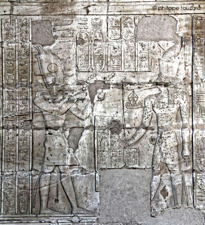 Le roi fait l'offrande de l'oeil Oudjat à Horus de Behedet.