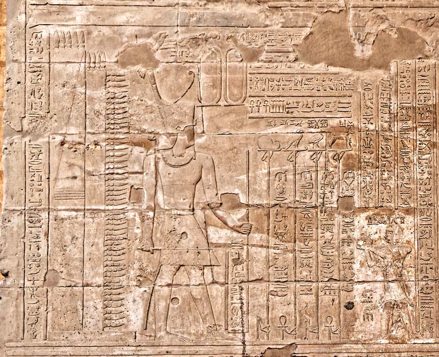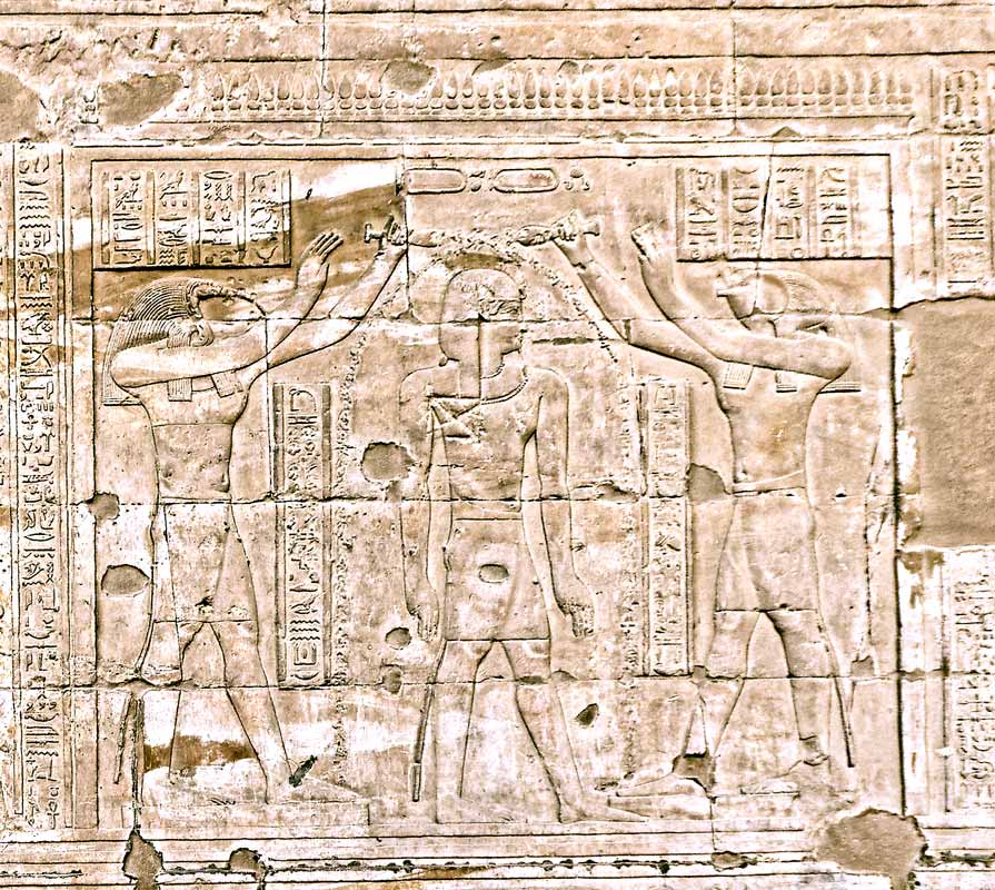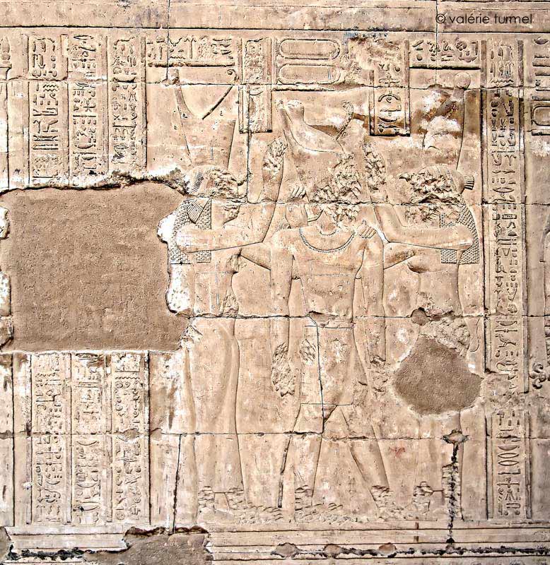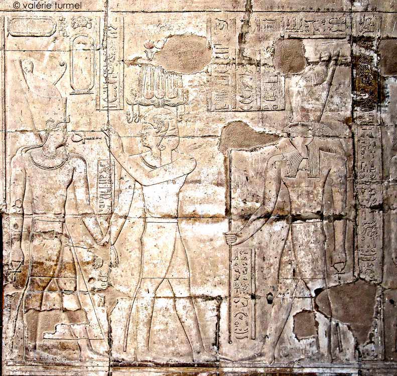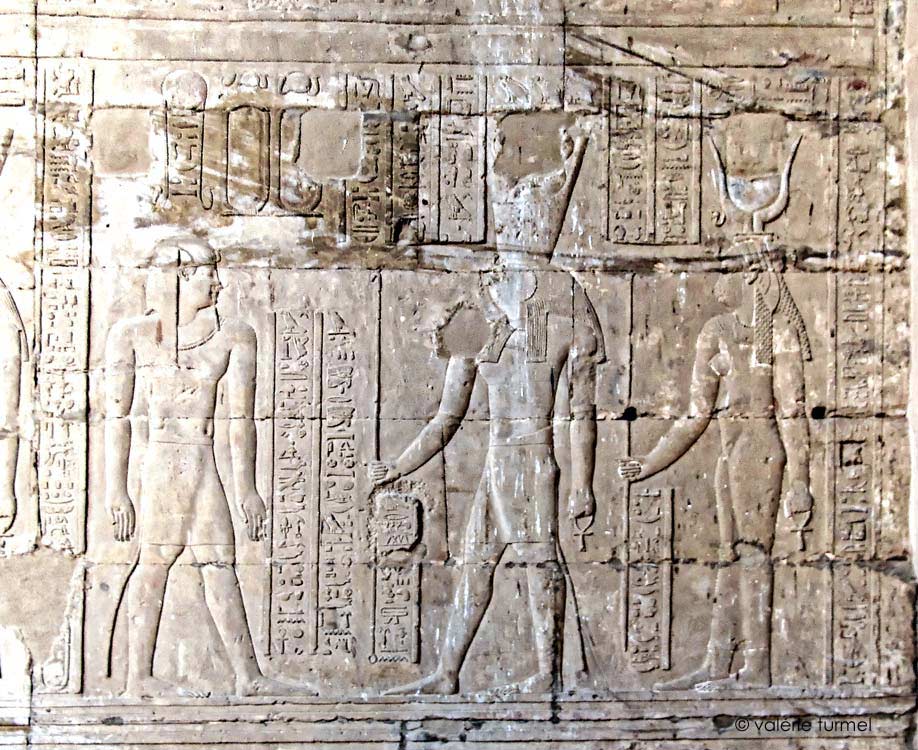 Le roi se tient devant Horus de Behedet et Hathor, dame de Dendara, oeil de Rê, qui réside à Edfou.