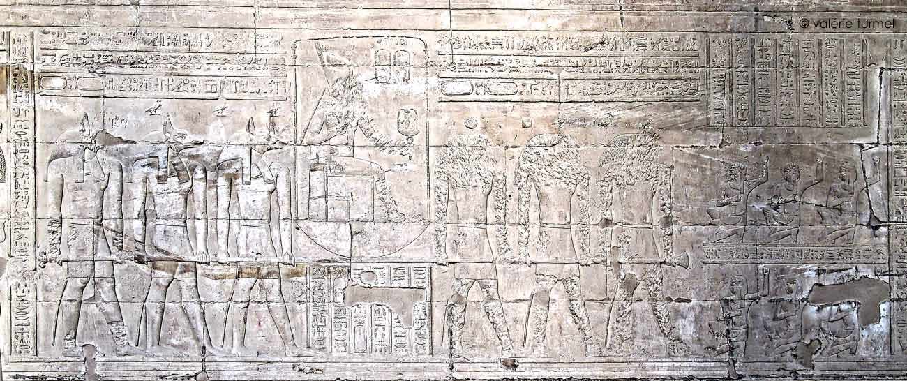 Cette scène de sortie du palais se retrouve à multiples reprises dans le temple et notamment symétriquement du côté Est de cette paroi Sud.