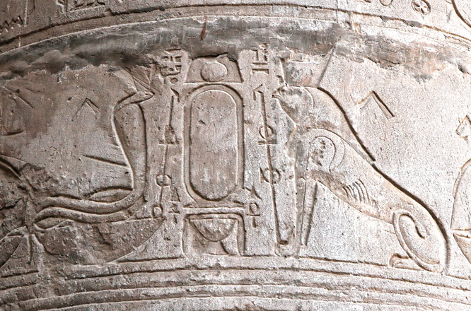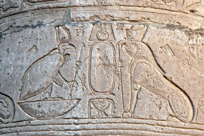 En haut Horus et Nekhbet entourent un cartouche vide.