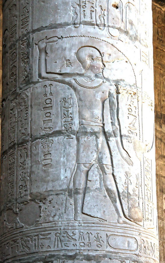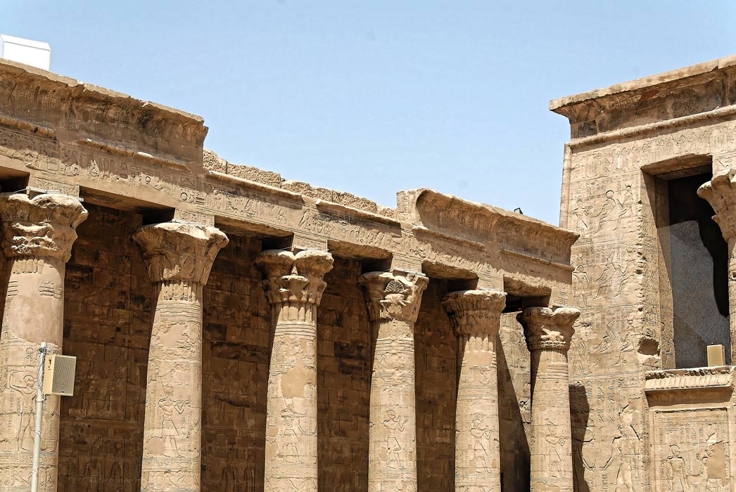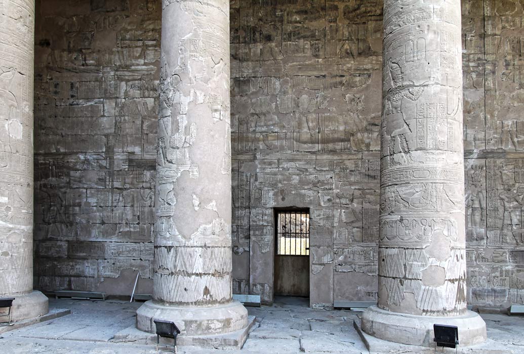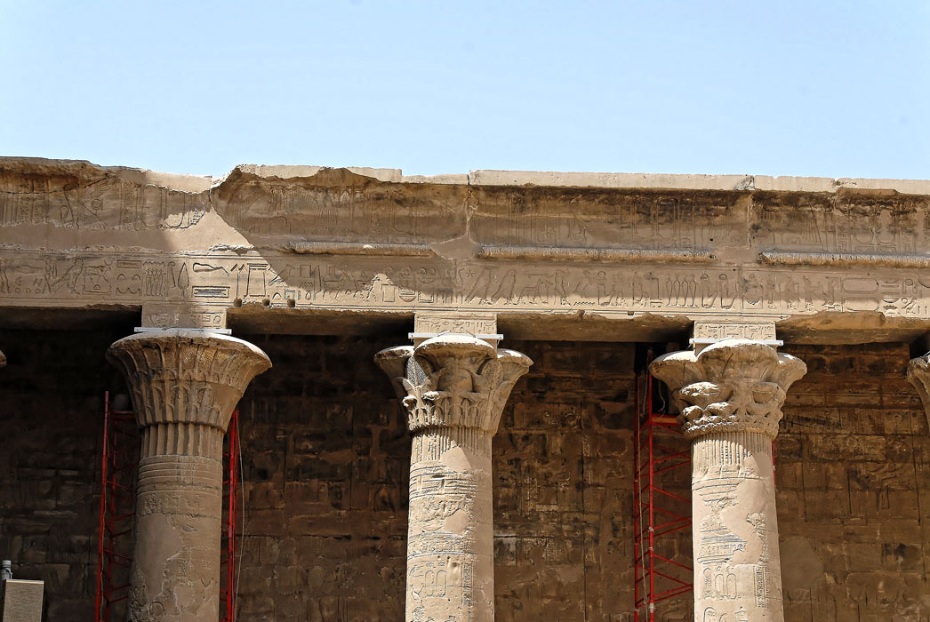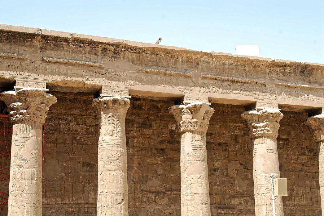 Le portique Ouest comporte 12 colonnes avec la colonne de l'angle, ce qui fait que le grand côté de la cour compte " fois plus de colonnes que le petit côté sur les 16 colonnes du total. La numérotation de Chassinat commence à la porte du pylône. (cf. Tome V, p.200). Cette vue montre les colonnes 6,7 et 8. Le teste de l'architrave est de Ptolémée XII Neos Dionysos.