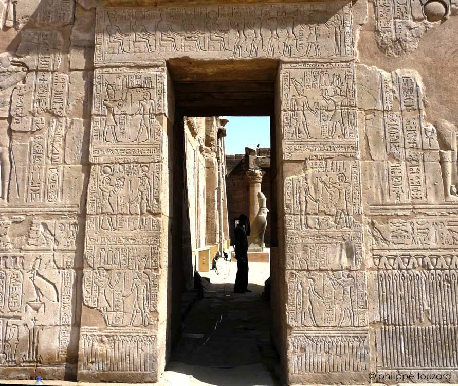 Cette porte se trouve au niveau de la façade du pronaos que l'on voit par l'ouverture.