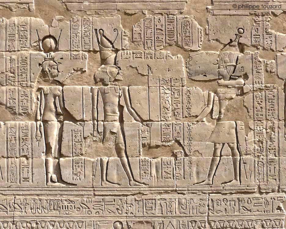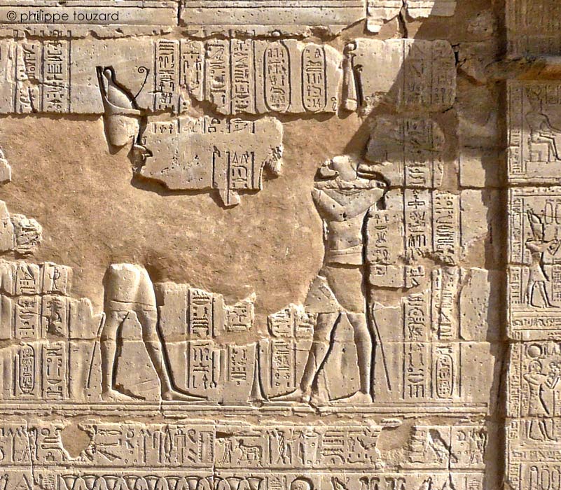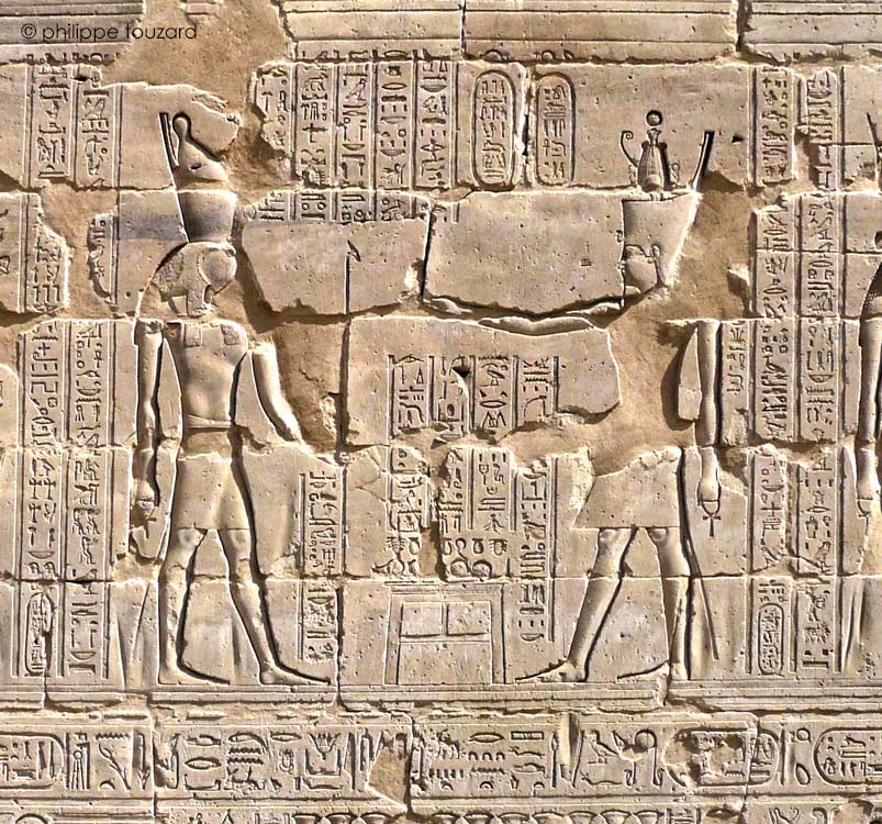 Le roi offre des plantes et des fleurs montées en bouquet à Horus de Behedet , le grand dieu, maître du ciel au plumage bigarré et à Hathor, dame de Iounet, œil de Rê, qui réside à EdfoU. Les fleurs rajeunissent le coeur du dieu et mettent en valeur l'éclat de son visage illuminé de joie. (Cauville, L'offrande, p.94)