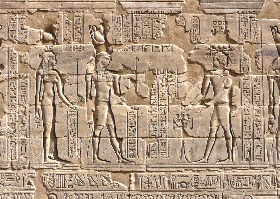 Devant le roi, Horus de Behedet et Hathor, dame de Iounet, œil de Rê, qui