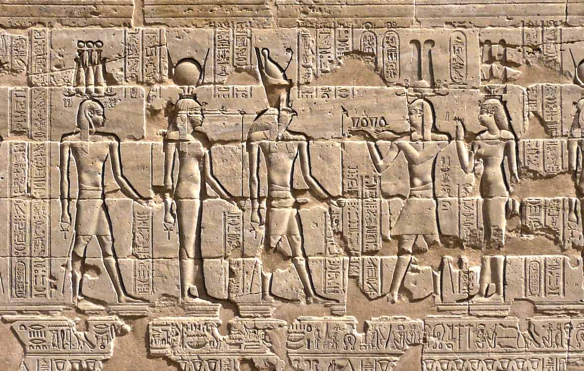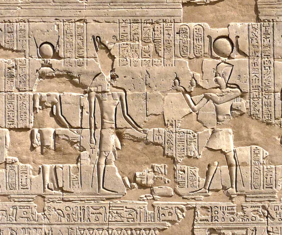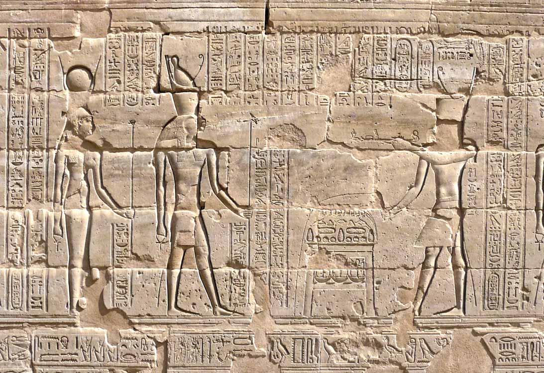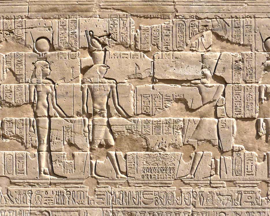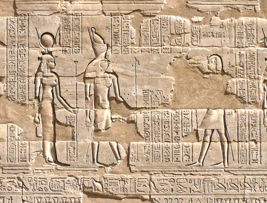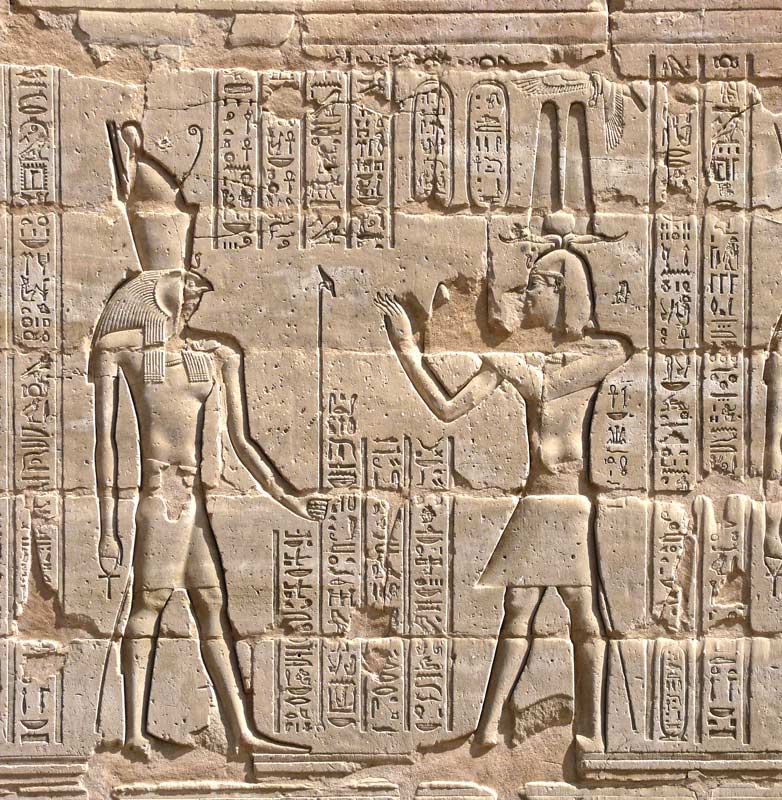 Le roi Ptolémée IX Soter offre 2 vases de lait à Horus de Behedet, le grand dieu, maître du ciel et Hathor, dame de Iounet, œil de Rê, qui réside à Edfou.