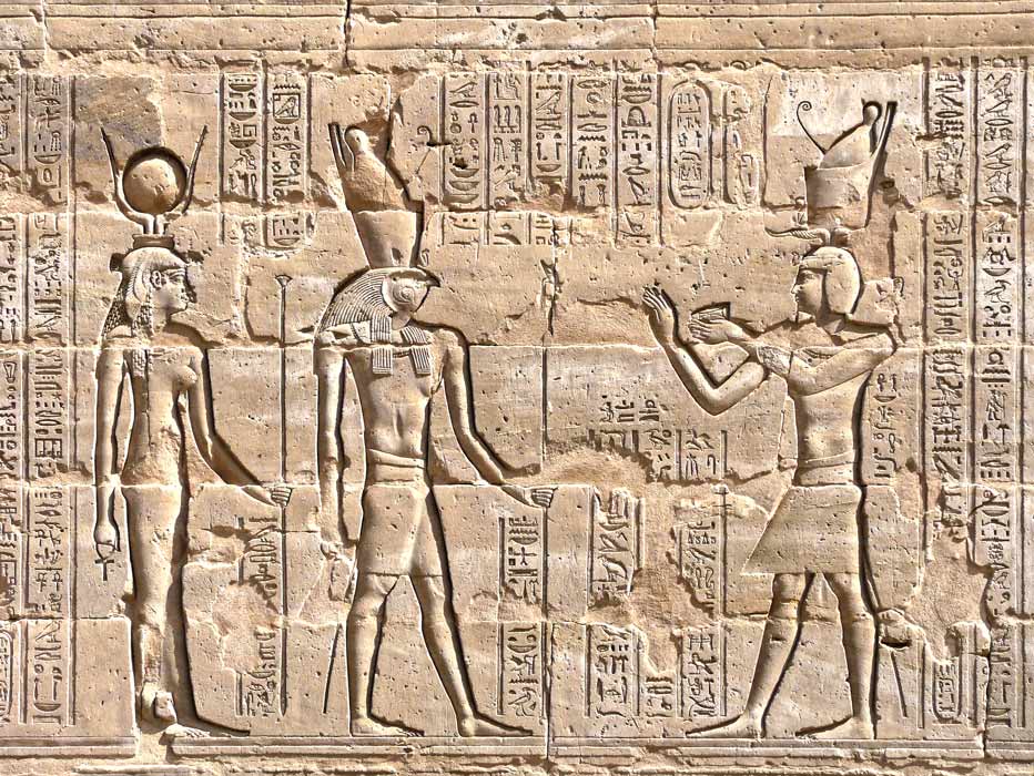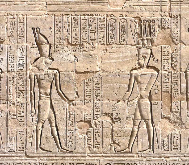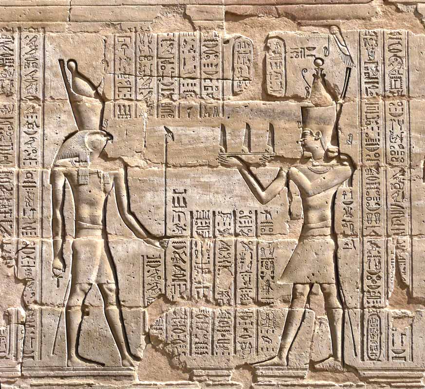 Le roi offre le pain chemes à Horus de Behedet, le grand dieu, maître du ciel, au plumage bigarré et à Hathor, dame de Iounet, œil de Rê, qui réside à Edfou. Ce pain allongé est offert souvent aux maîtres du temple.