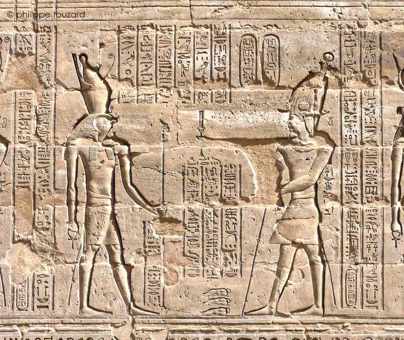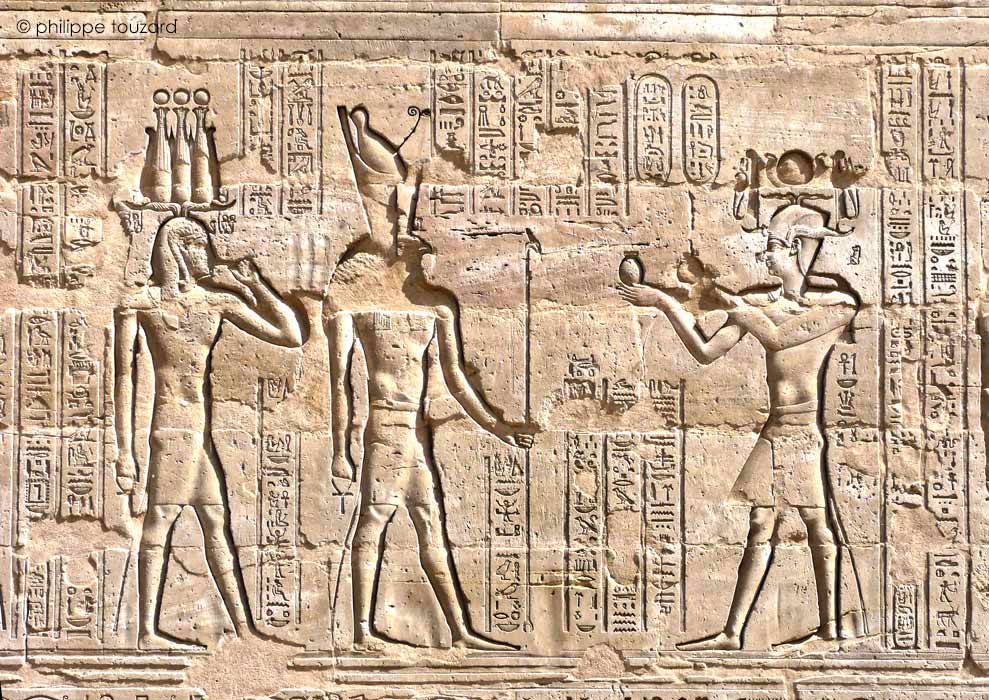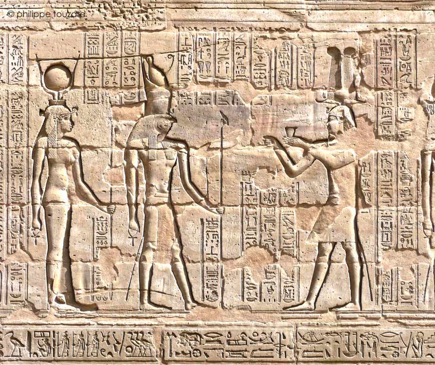 et à Harsomtous, fils d'Hathor. Cette scène d'offrande du vin est représentée 65 fois dans le temple d'Edfou.