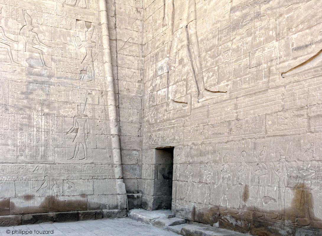 La paroi Ouest est, comme la paroi Est jointe au pylone avec un petit muret de pierres avec des scènes de Ptolémée XII Neos Dyonisos. A droite, l'envers du pylône est décrit par ailleurs.
