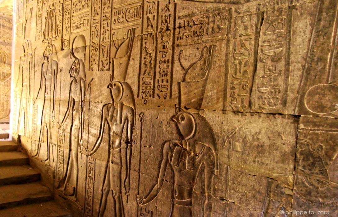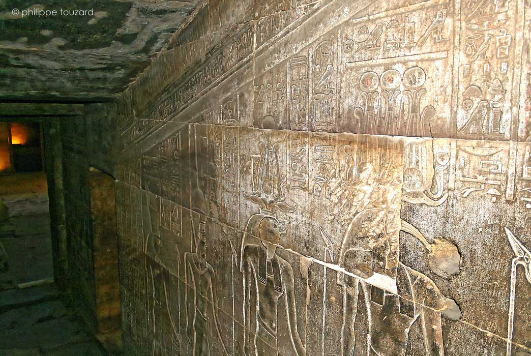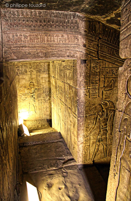 L'escalier secondaire rejoint l'escalier principal. Dans le fond, on aperçoit ses dernières marches et une des représentations des porteurs d'offrandes. A droite, Horus sur la paroi Sud.