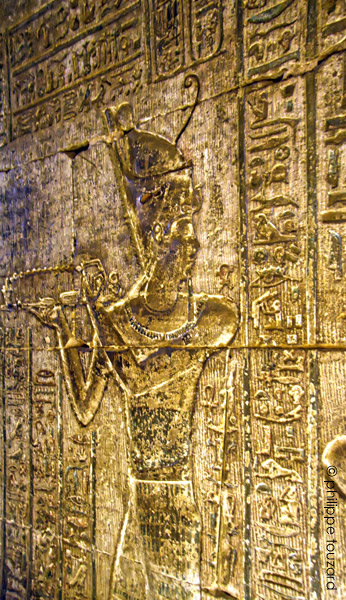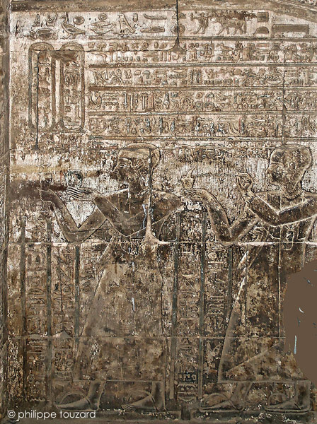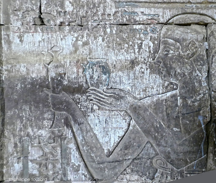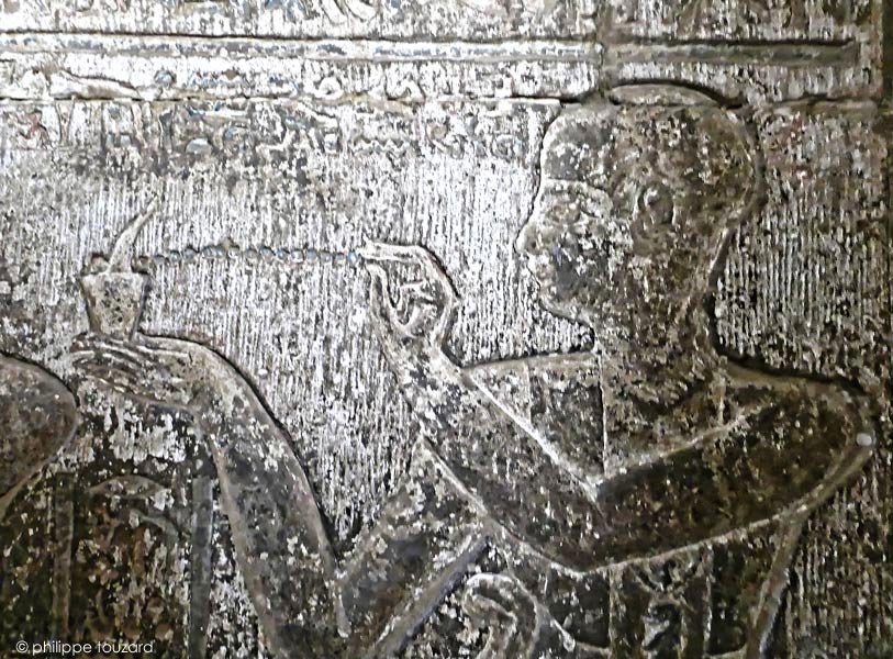 Bien que regardant vers le naos, le roi continue de lancer des boulettes d'encens dans l'encensoir.