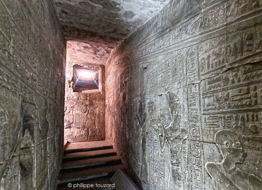 Cette section de l'escalier montre la montée des naos. A gauche, le naos d'Hathor est précédé par un roi qui tourne la tête vers le naos et un autre roi qui conduit la procession. A droite, le naos d'Horus est précédé en plus par la reine..Le roi tourne la tête vers le naos.
