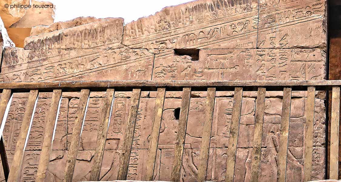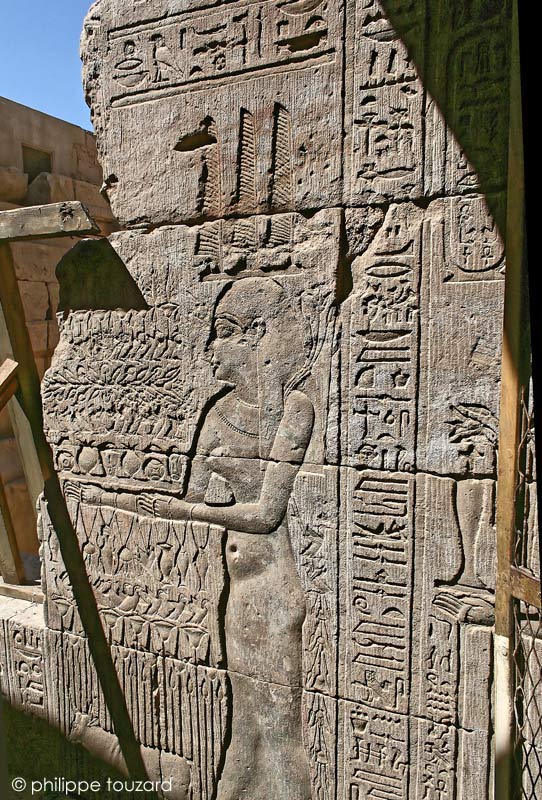 Derrière elle, un dieu Nil du Sud avec une aiguiére et des fleurs. On aperçoit une partie de la structure de la porte moderne qui ferme l'escalier juste avant cette partie.