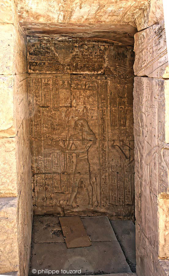La paroi Ouest se termine avec un homme portant des nombreuses offrandes. Un petit taureau l'accompagne entre ses jambes Il est suivi par une femme portant 2 vases..